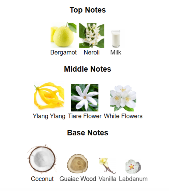 Delicate tiare flower and ylang-ylang lead to a comforting base of vanilla and guaiac wood.